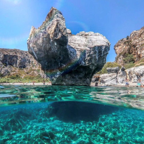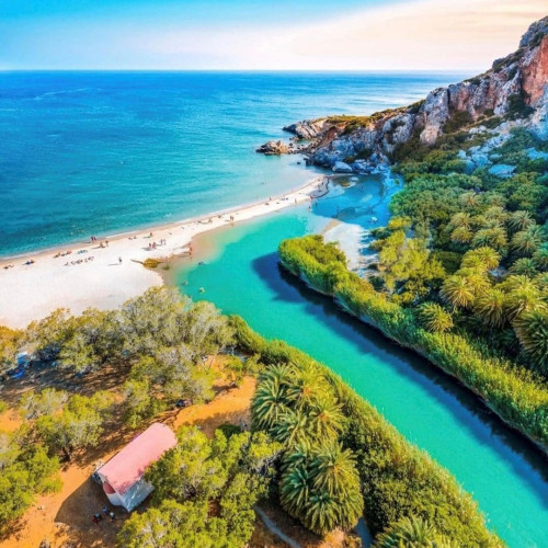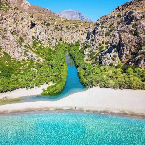 Located on the south coast, Preveli Beach is where the Kourtaliotiko River meets the Libyan Sea. Surrounded by palm trees, this unique beach offers visitors a refreshing swim in both the river and the sea, all set within a picturesque landscape.
